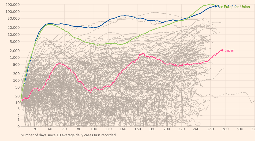 2020-11-28 秋のリバウンド ちょっとデータの反映が遅い Financial Times 誌の分析でも、ついに日本でも1日2000人を越しました。 どのように「無症状の感染者」を見つけ出して保護していくのかがカギというのが、世界のスタンダートな理解となっています。しかし日本では、あいかわらず症状がでた人だけを対象にしているところが、問題の根源だと思うのですよね。感染症を抑えこんでからでないと、経済はちゃんと回せないですよ。